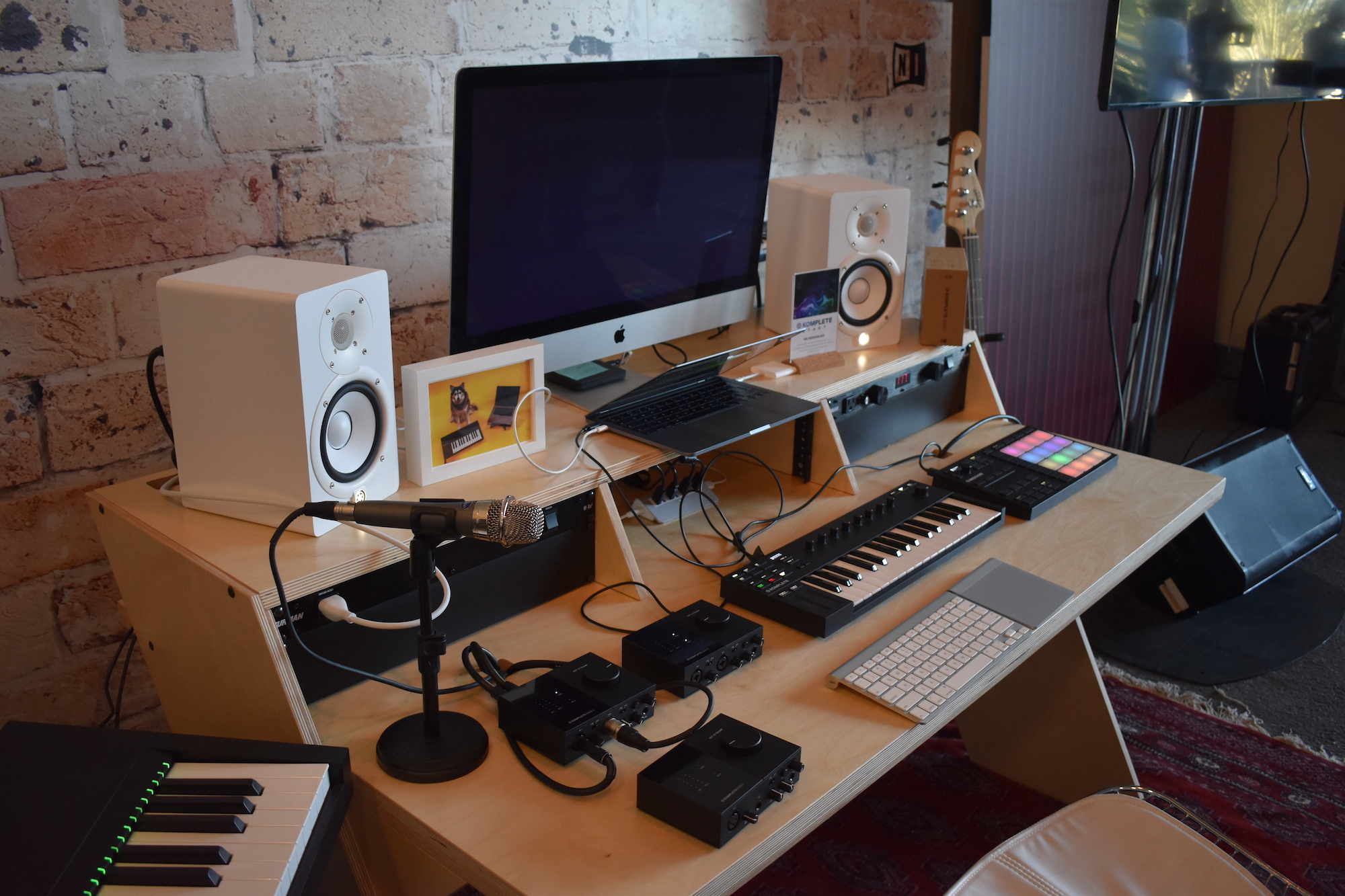 Native Instruments introduced a number of new items, including KOMPLETE KONTROL M32, a micro-sized keyboard controller, and KOMPLETE AUDIO 1 and 2, a pair of simple, two-channel audio interfaces that come with a ton of software (a pair of 2s are next to the keyboard, while a 1 is beneath them).