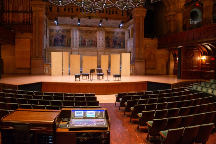 The university’s main concert hall hosts many classical and chamber music performances, which are unamplified. Other times, the venue features events with greater technical demand, such as discussion panels, film screenings and fully amplified jazz and big band concerts.