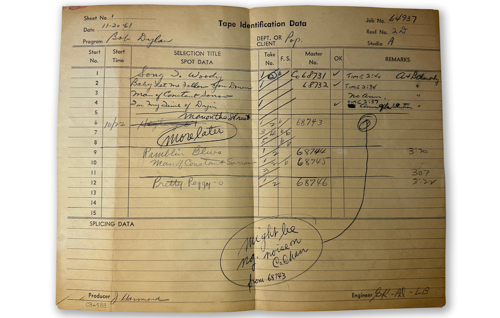 Three of the four outtakes were eventually released on Volume One of Dylan’s famed Bootleg Series—”House Carpenter,” “He Was a Friend of Mine” and “Man on the Street”—but the fourth, a cover of Woody Guthrie’s “Ramblin’ Blues,” has never been released. Also included are complete tape logs, listing track titles, notes and more, all of which are signed off on by Hammond.