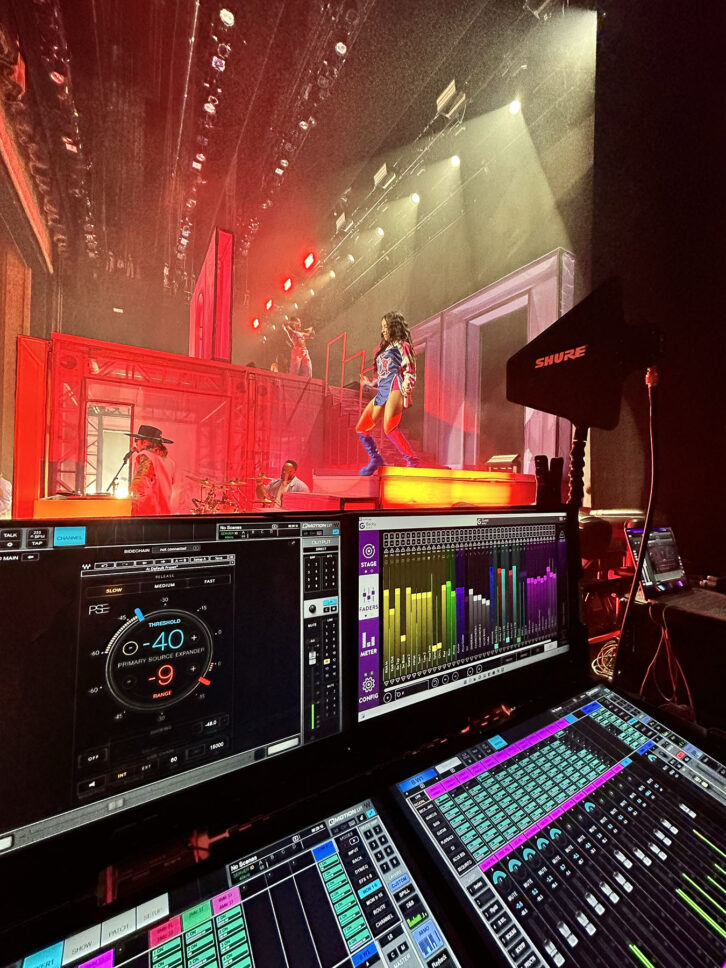 “One thing that we all appreciated every night was that I used two ambient microphones on stage left and stage right for Becky’s mix. She interacts a lot with the audience during her show, actively listening to them, inviting them on stage, and sharing moments with them. Depending on the moment of the show and the interaction she was having, I would change the position of the ambient microphones—sometimes to the sides, sometimes behind—or I would place them forward and louder in the mix between songs and interludes. This allowed her to jokingly say during the show, ‘I’m so happy to see you up close and hear you too, so you can’t talk bad about me!’ Everyone would laugh night after night. The immersive KLANG system enabled her to be able to locate the microphones and gave her the confidence to know where that person who was speaking, so she could point at them and say, ‘I love you too!’