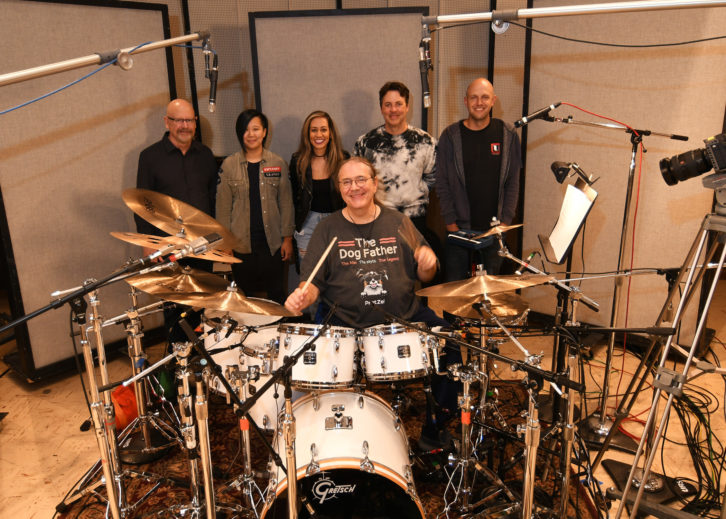 Pictured in United Studio B are drummer Vinnie Colaiuta with (L-R rear) recording engineer Don Murray, keyboardist Ester Na, Lari Basilio, bassist Sean Hurley, and United staff engineer Scott Moore. Photo by David Goggin.