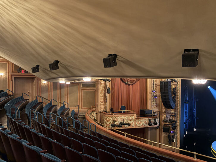 Gayle’s Two Strangers design features left and right main arrays, each comprised of 10 Kara II enclosures addressing the orchestra and mezzanine seating areas. Flown above those hangs are two arrays of five Kara II per side that cover the upper balcony seating. Between those two upper arrays are three A Series loudspeaker hangs—three A10 Focus over two A10 Wide—interspersed with a pair of LF hangs both featuring a trio of SB18 subs. Two additional SB18 are located one per side behind and beneath the main Kara II arrays.