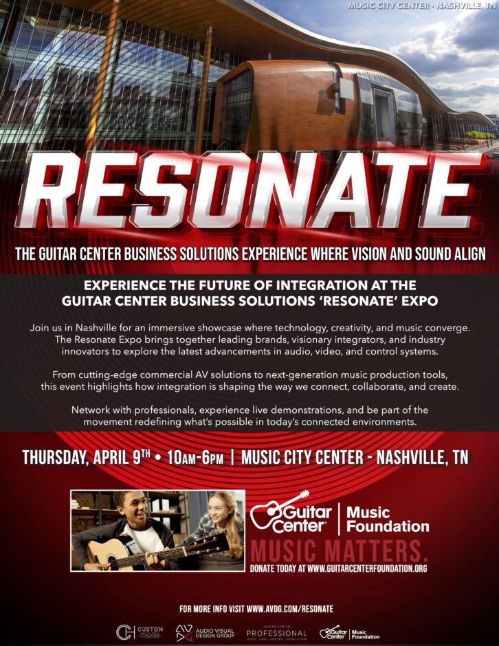 Nashville, TN — Guitar Center Business Solutions announced today the inaugural Resonate, the company’s first dedicated industry expo, launching in Nashville to showcase the future of integrated audio, video and control technology. The free, one-day event will take place Thursday, April 9, from 10 a.m. to 6 p.m. CDT at the Music City Center in Nashville. The expo will bring together leading brands, integrators and decision-makers across music, education, venues and enterprise. Nashville was selected as the host city for Resonate because it reflects the convergence shaping today’s market and serves as the headquarters of Guitar Center Business Solutions.