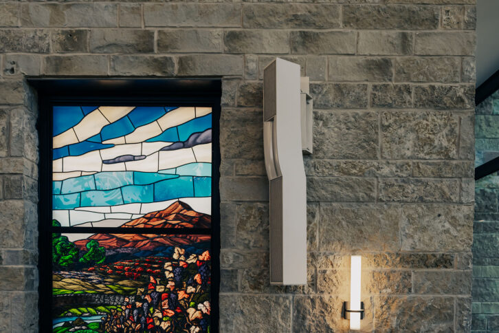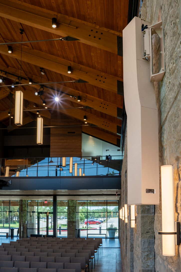 “The look and feel of the chapel is beautiful, but there are a lot of reflective surfaces,” Fuller observes. The area behind the stage is all glass, while the stone side walls have windows and the building has a high-pitched roof. “It’s a traditional design, but with a modern take, and the aesthetics are huge. So everything we did, especially with the audio portion, had to fit into that. We really had to think about the system design from an ideal performance and coverage perspective, but in a way that would not detract from the beauty of the room.”