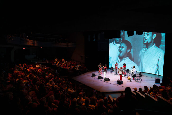 “In the youth programming, we have performing arts, visual arts, and technical arts,” explains Homstead. “There are kids in the technical arts track who are learning real-world production skills.” The middle and high schoolers can learn through classes and youth programs, and they can also intern on the professional productions that come to the center. “The whole place is essentially a learning lab for young people,” he notes, adding that the unusual architecture of the theater, which is a half-round stage with an octagonal thrust, lends itself to immersive technologies that can connect artists and audiences.